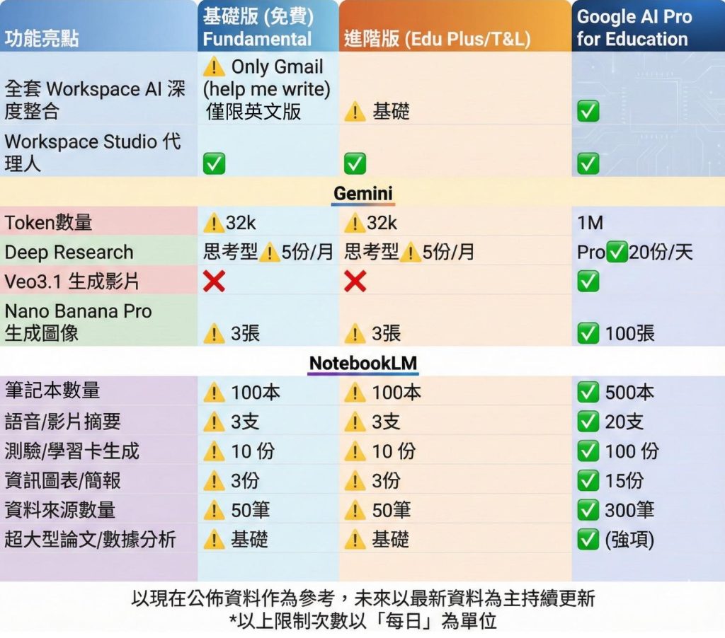 | 版本 | Education Plus | Education Fundamentals | Education Fundamentals | 依個人需求購買 Google One |