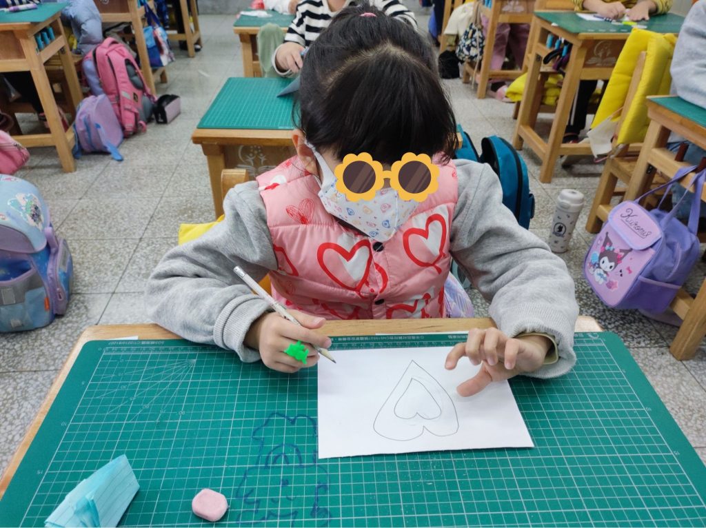 我們先用圖畫紙+彩筆畫出想要的框,可以是方形、圓形或愛心形,加上一些代表春天的事物,例如:花朵、蜜蜂、蝴蝶…,相框裡面寫上一個「+」,用剪刀剪十字2刀,自己小心撕開,完成獨一無二的相框。