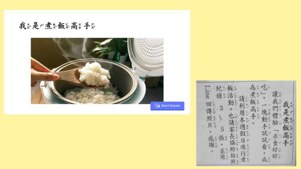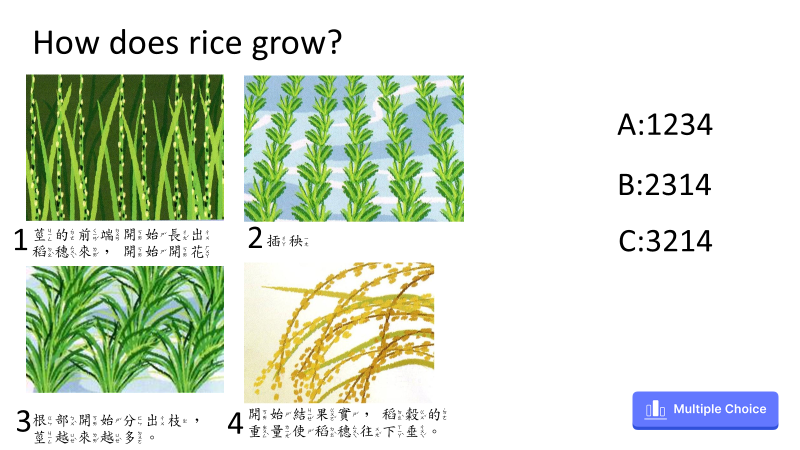 接著進入「米的專家」單元,本想透過專家親自介紹,讓孩子能更了解稻米及其生長過程,但受限於無法邀請到曾經有種稻米經驗的專家,老師以「ClassPoint」設計簡報與出題,學生透過代碼加入教室,可以同時看到投影片,也能作答題目。