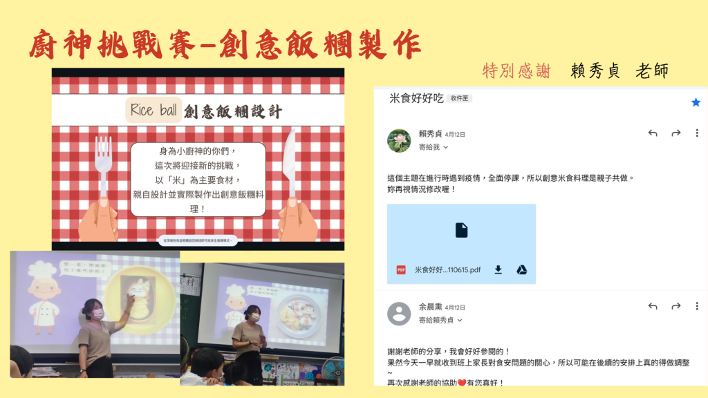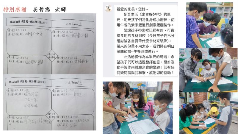 因此,與同學年老師討論後,共備時原訂的「米的辦桌分享會」,修改成創意飯糰製作。