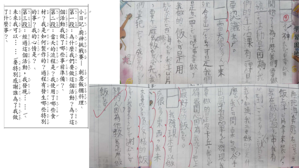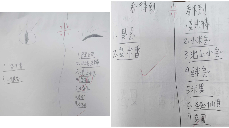 我們從「米食分享同樂會」開始,孩子們自行準備米製品,在分享會上,孩子們品嘗了飯糰、米餅、米果、蘿蔔糕和糕仔,用九宮格記錄下自己品嘗到的米製品,也透過T圖了解米食的特性: