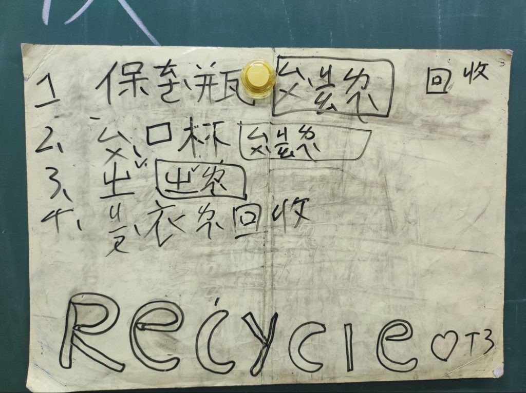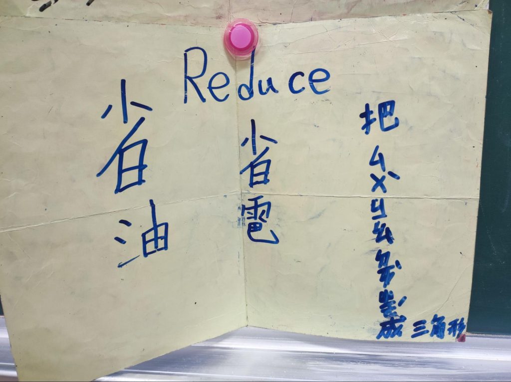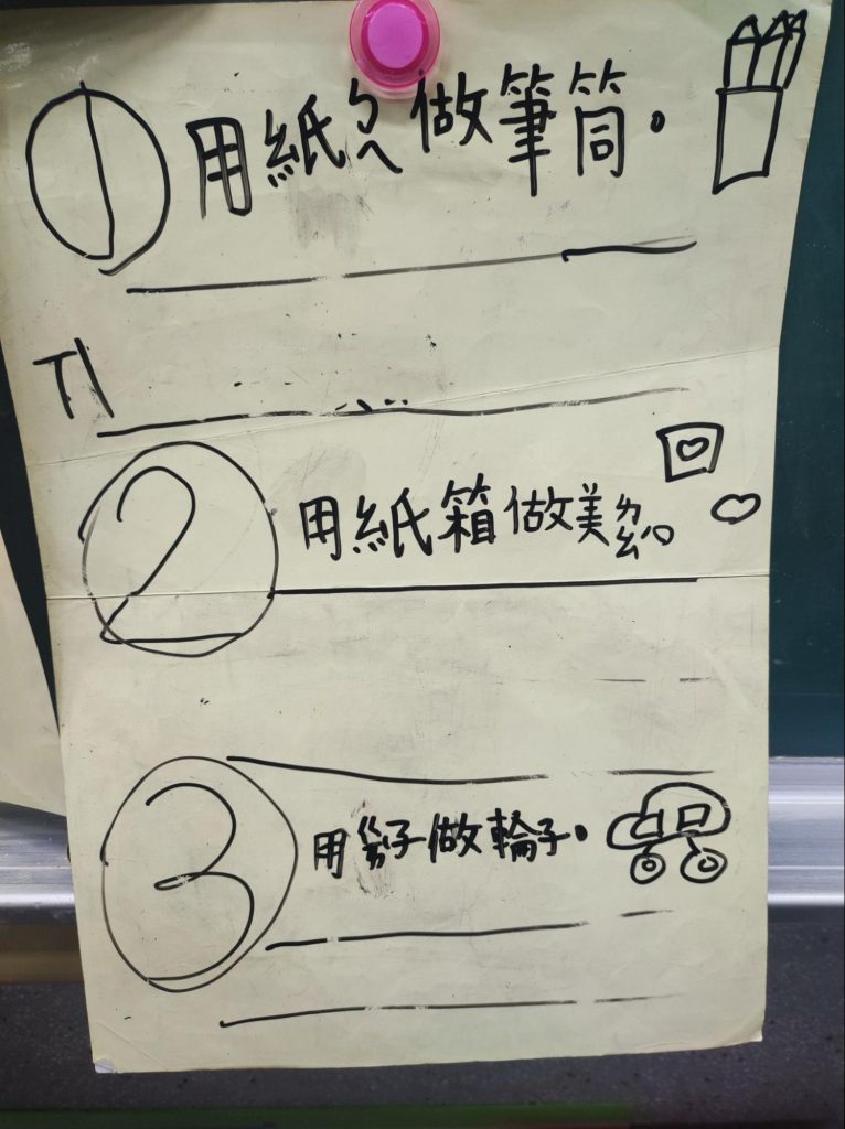 小白板上的內容經老師確認無誤後,組內合作一起在圖畫紙上進行美工及排版,最後撰寫並練習介紹詞,介紹詞就是平常上台時,需要跟大家問好的禮儀,一一介紹自己是誰,再說明可以採取哪些行為達到「減量(Reduce)」、「重複使用(Reuse)」和「回收再利用(Recycle)」。