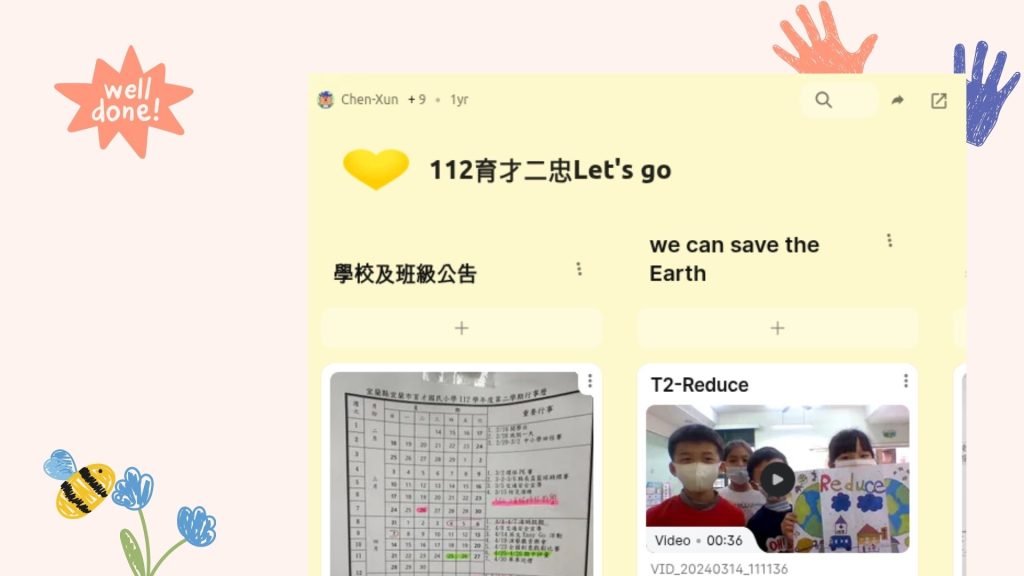 *本班利用Padlet作為班級網頁,老師會在平台上公告學校相關訊息及學生作品(如:影片、小日記…等),讓家長可以共享孩子的學習成果。