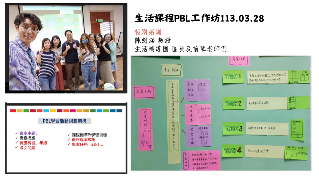 在113年3月,參加了生活課程輔導團舉辦的PBL工作坊,當時特別邀請了劍涵教授陪伴生活團及伙伴老師們一同備課,我們除了認識PBL的相關概念,小組也以「PBL專案歷程」的模式設計了「米食好好玩」專案,並將其帶回各自的班級實施。