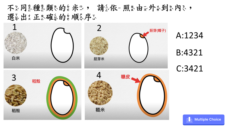 2.找出不同種類的米,依照由外到內,選出正確的順序→選擇題