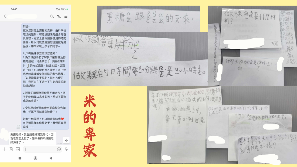 認識稻米之後,原本設想是邀請多位家長入班協助製作不同的創意米製品料理,但是有食安上的考量與校內設備有限,因此後來改成邀請班上家長入班,分享製作米製品的方法與經驗,以及回答孩子們事先擬定的問題。